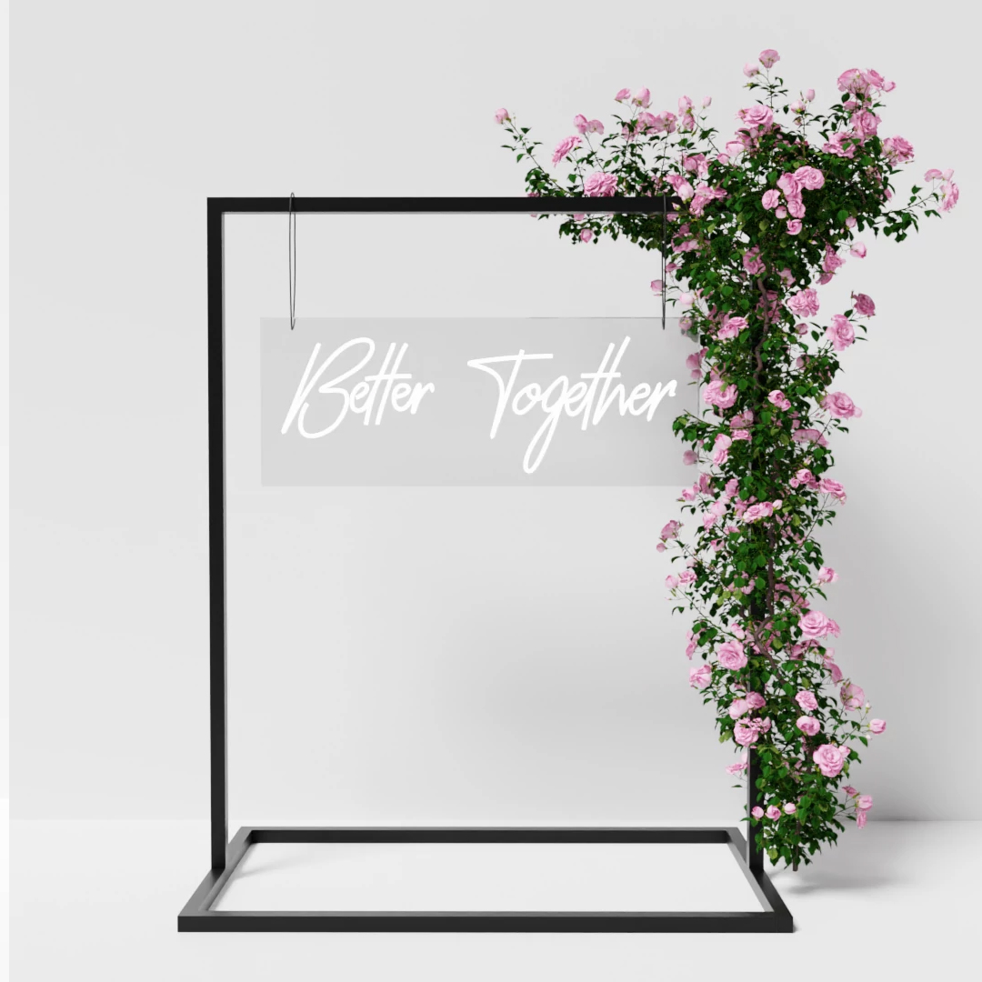 - Alquiler de carteles neón para bodas: para estos eventos se suelen elegir distinas palabras o formas románticas como corazones enlazados o frases "better tonight", "love is in the air", "siempre juntos", "besame mucho". Puedes ubicarlo en la zona donde se disfruta del banquete o crear una zona especial para sacarse fotos con el cartel.
